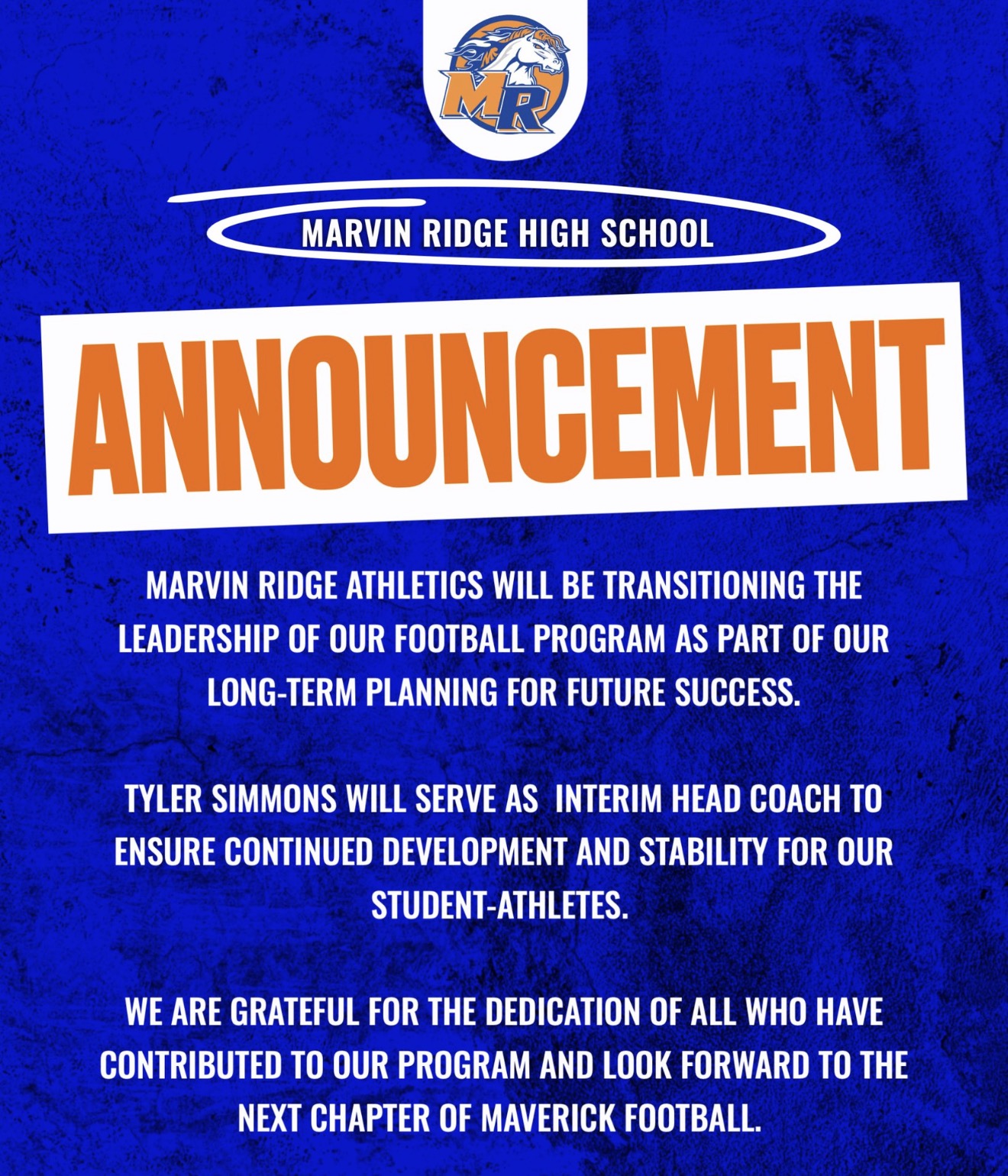 The Marvin Ridge Maverick are searching for their new HC after parting ways with Aubrey Carter after 11 seasons. Carter took over the Mavericks program prior to the 2025 season. From Brad Hoover. Carter leaves Marvin Ridge with a 72-53 record. Marvin reached the playoffs in 10 seasons, only missing out on the COVID season of 2020. Marvin Ridge has only been to the 3rd Round of the playoffs once in 2015 under Carter.